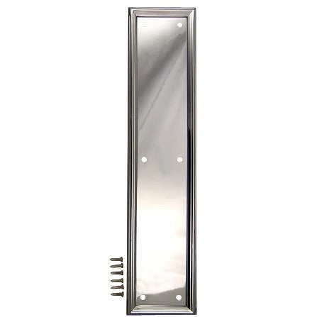 15 Inch Solid Brass Framed Push Plate (Polished Chrome Finish) - measures 15 inches tall and 3 1/2 inches wide. Comes complete with the mounting hardware. Available in several finishes.