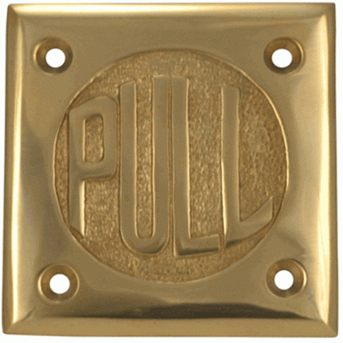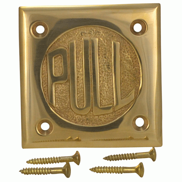 2 3/4 Inch Brass Classic American "PULL" Plate (Lacquered Brass Finish) - The plate measures 2 3/4 Inches on all sides and is approximately 1/8 of an inch thick. Mounting hardware is included. Please email customerservice@lookintheattic.com to place a custom order for this knob.