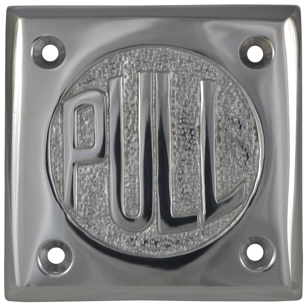 2 3/4 Inch Brass Classic American "PULL" Plate (Polished Chrome Finish). The plate measures 2 3/4 Inches on all sides and is approximately 1/8 of an inch thick. There is also a "PUSH" variation available. Includes 4 wood screws as mounting hardware. Adds a clever vintage design aspect to any door on your home or business.