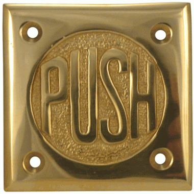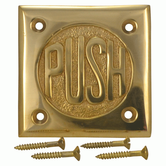 2 3/4 Inch Brass Classic American "PUSH" Plate (Lacquered Brass Finish). The plate measures 2 3/4 Inches on all sides and is approximately 1/8 of an inch thick. There is also a "PULL" variation available. Includes 4 wood screws as mounting hardware. Adds a clever vintage design aspect to any door on your home or business. Please email customerservice@lookintheattic.com to place a custom order for this knob.