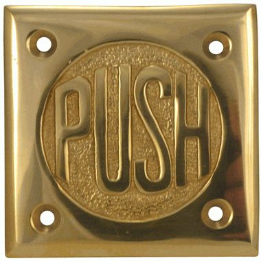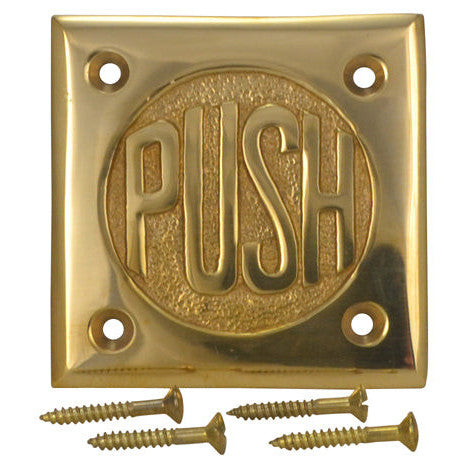 2 3/4 Inch Brass Classic American "PUSH" Plate (Polished Brass Finish). The plate measures 2 3/4 Inches on all sides and is approximately 1/8 of an inch thick. There is also a "PULL" variation available. Includes 4 wood screws as mounting hardware. Adds a clever vintage design aspect to any door on your home or business. This product comes as an unlacquered natural brass and it will patina over time. A high strength lacquer coating is available upon request.