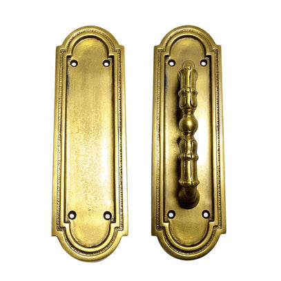 8 3/8 Inch Solid Brass Arched Style Push And Pull Plate (Antique Brass Finish) - each plate measures 2 1/2 inch wide and 8 3/8 inch tall. The handle measures 5 inches overall with 4 1/2 inch center-to-center mounting, and projects 1 1/2 inches. Comes complete with mounting hardware.
