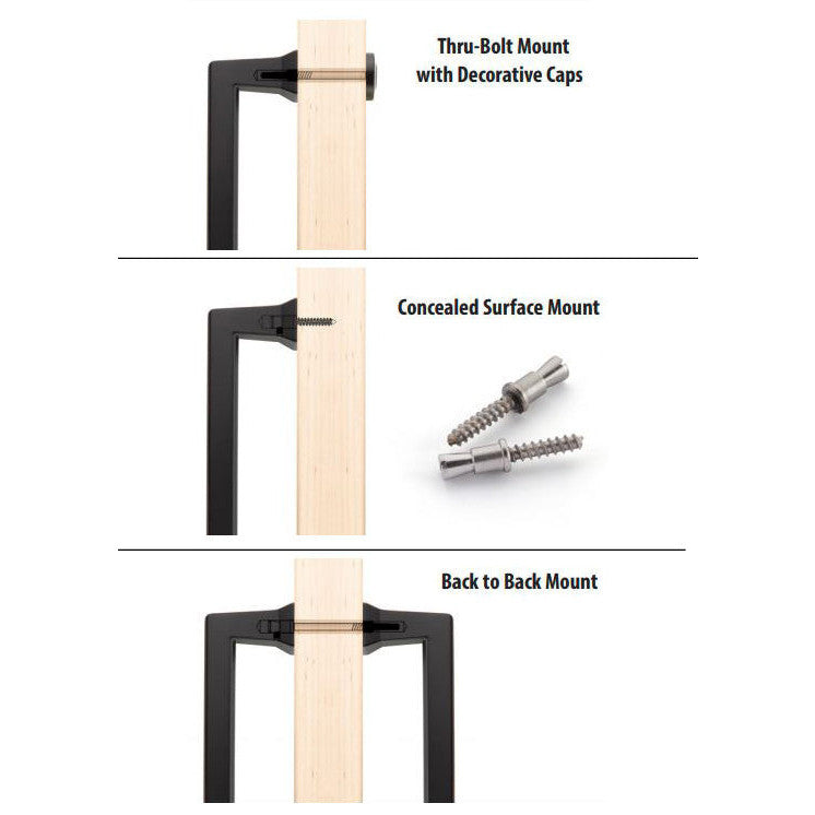 9 13/16 Inch Sandcast Bronze Rod Pull - this door pull is constructed from solid brass and measures 9 13/16 inches end-to-end by 3/4 inches wide. Its projection is 2 9/16 inches and its center-to-center measurement is 8 inches. It has a base diameter of 1 13/16 inches. Comes in a variety of finishes, including Medium Bronze and Flat Black bronze. Drilled and tapped with 1/4 inch-20 thread. Comes complete with mounting hardware specific to the mounting style you choose from the diagram.