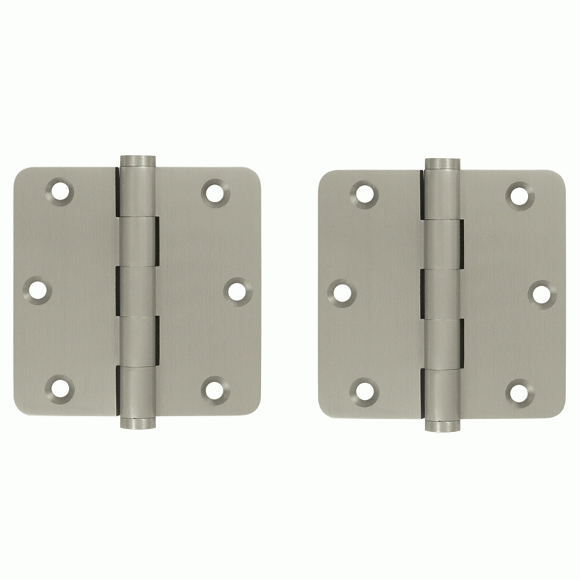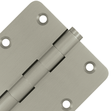 Pair 3 1/2 Inch X 3 1/2 Inch Solid Brass Hinge Interchangeable Finials (1/4 Radius Corner, Brushed Nickel Finish) - measures 3 1/2 inches by 3 1/2 inches and comes complete with the mounting screws. These are heavy duty standard hinges shown with 1/4 inch round corners - available in square or rounded corners.