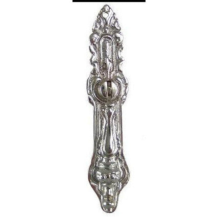 4 Inch Solid Brass Baroque / Rococo Drop Pull (Polished Chrome Finish) - drop pull is 2 1/2 inches long and the back plate measures 4 inches by 5/8 inches. Comes complete with the mounting hardware.