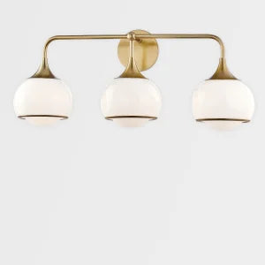 The Reese Wall Sconce by Mitzi combines elegance and functionality with its opal glossy glass shade and aged brass finish option. This stylish fixture features a width of 26.75 inches, a height of 11.25 inches, and a 7.25-inch extension, making it a striking addition to any space. Designed to accommodate three E26 medium base bulbs (not included), each with a maximum wattage of 60W, this sconce is perfect for providing ample illumination. Additionally, the ul damp electrical rating ensures its suitability for use in humid environments.