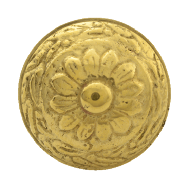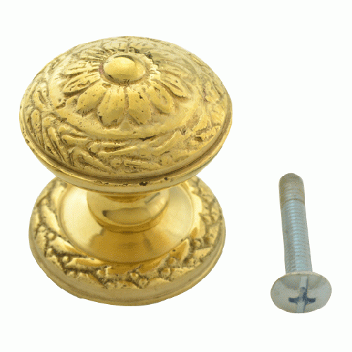 1 1/4 Inch Ornate Round Solid Brass Knob (Lacquered Brass Finish) - This knob measure 1 1/4 inches in diameter with a projection of 1 7/20 inches. Available in polished brass (shown), antique brass, Black Bronze, and polished chrome finishes. Comes complete with the mounting hardware. Please email customerservice@lookintheattic.com to place a custom order for this knob.