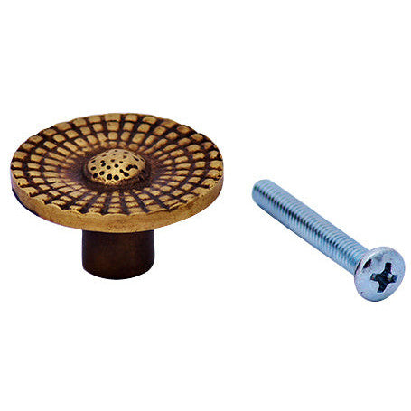 1 Inch Solid Brass Art Deco Style Round Knob (Antique Brass Finish). Measures 1 inch in diameter with a projection of 2/3 inch. Comes complete with mounting hardware. Available in several finishes including polished brass, antique brass, Black Bronze, polished chrome, Satin Nickel, and flat black.