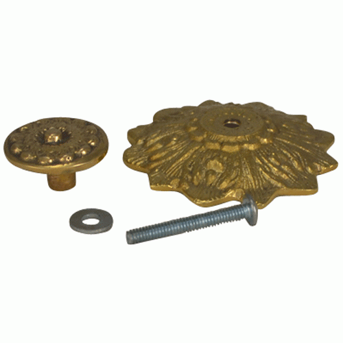 2 2/5 Inch Solid Brass Victorian Sunflower Knob (Lacquered Brass Finish) - Measures 2 2/5 inch in diameter with a projection of 1 1/5 inch. Comes complete with mounting back plate and hardware. Available in several sizes and finishes including polished brass (shown), antique brass, Black Bronze, polished chrome, Satin Nickel, and flat black. Please email customerservice@lookintheattic.com to place a custom order for this knob.
