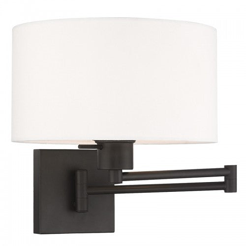 The 40036-07 Swing Arm Wall Lamp is a versatile addition to any space, perfect for installation bedside or above a reading chair to enhance illumination. With a transitional bronze finish, this lamp features a hand-crafted off-white fabric hardback shade that adds a touch of subtle texture to your decor. Measuring 11 inches in width and height, it extends 24.25 inches to provide flexible lighting options. This fixture accommodates one medium base bulb (not included) with a maximum wattage of 100W. Additionally, it is suitable for damp locations and comes with a 3-way switch and two 12-inch cord covers for easy setup.