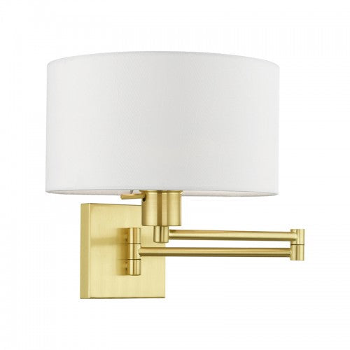 The 40036-12 Swing Arm Wall Lamp is a refined and sophisticated lighting solution perfect for enhancing your living space. Featuring a versatile design, this lamp extends from 11 to 24.25 inches, accommodating various lighting needs. With a stylish satin brass finish and a hand-crafted off-white hardback fabric shade, it adds a modern touch to any decor. The lamp requires one medium base bulb with a maximum wattage of 100W (bulb not included) and is suitable for damp locations, making it a great choice for bedrooms or reading nooks. The included 8-foot cord and two 12-inch cord covers provide flexibility for installation, allowing for both plug-in and hard-wired options.