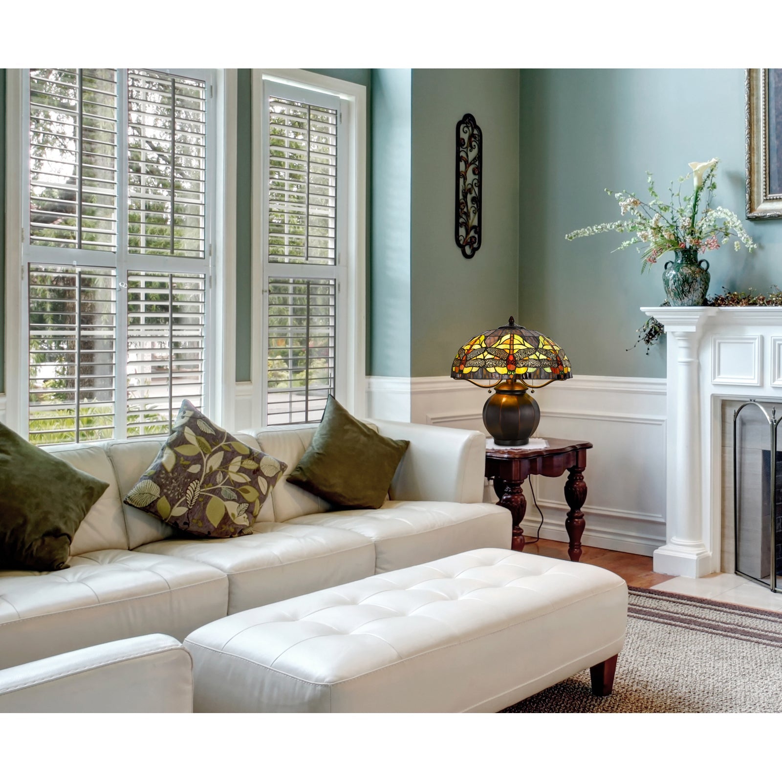 The BO-3012TB Tiffany table lamp is a stunning addition to any decor, featuring a unique dragonfly design on its dome-shaped stained glass shade. With a stylish dark bronze metal body, this lamp operates with two E26 bulbs at a maximum wattage of 60W each. It boasts dual pull chain switches for convenience and has a distinctive ginger jar design complemented by a matching finial and a curved upper base. The lamp requires minimal assembly and is backed by a one-year warranty, ensuring it is both a beautiful and practical choice for your home.