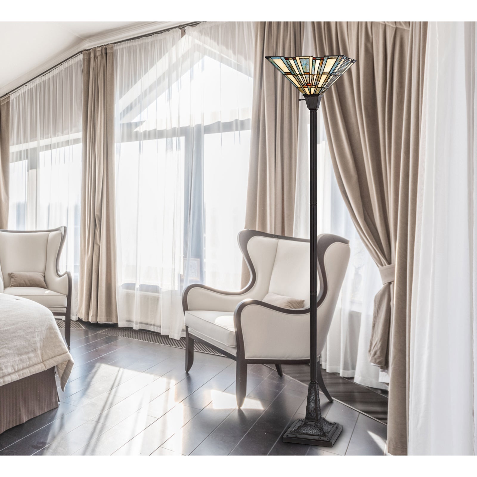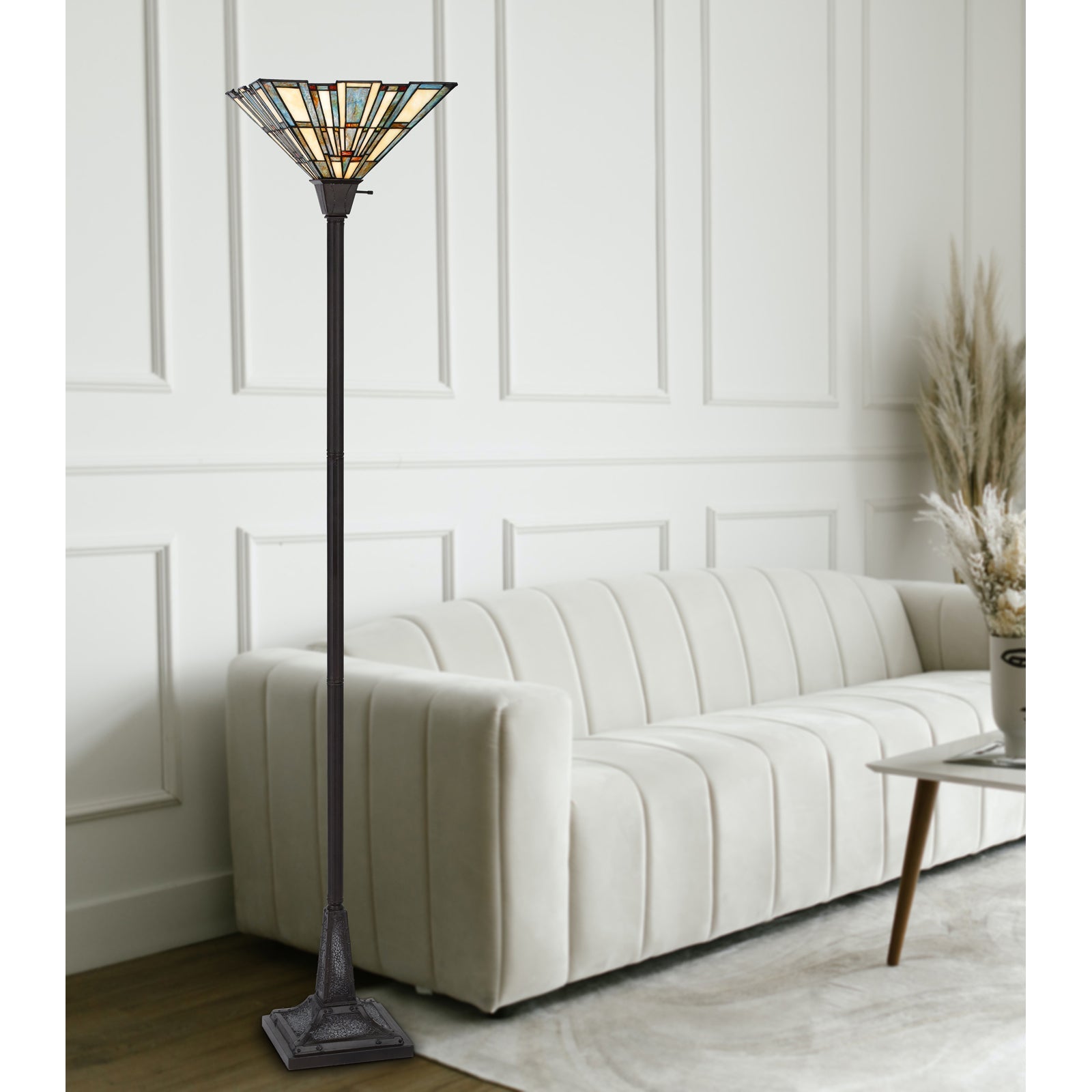 The BO-3100TR Tiffany Torchiere Floor Lamp is a stunning addition to your home decor, featuring a vibrant hand-painted Tiffany glass shade that adds a pop of color to any room. Constructed from durable resin and metal, this lamp ensures long-lasting quality. It operates with a convenient 3-way on/off switch located on the socket and includes a weighted base for enhanced stability. Designed to accommodate one E26 bulb with a maximum wattage of 150W, this elegant lamp measures 18.80 inches in length, 13.80 inches in width, and 25.50 inches in height. It ships in one carton and comes with a one-year warranty, assuring you of its craftsmanship and materials.