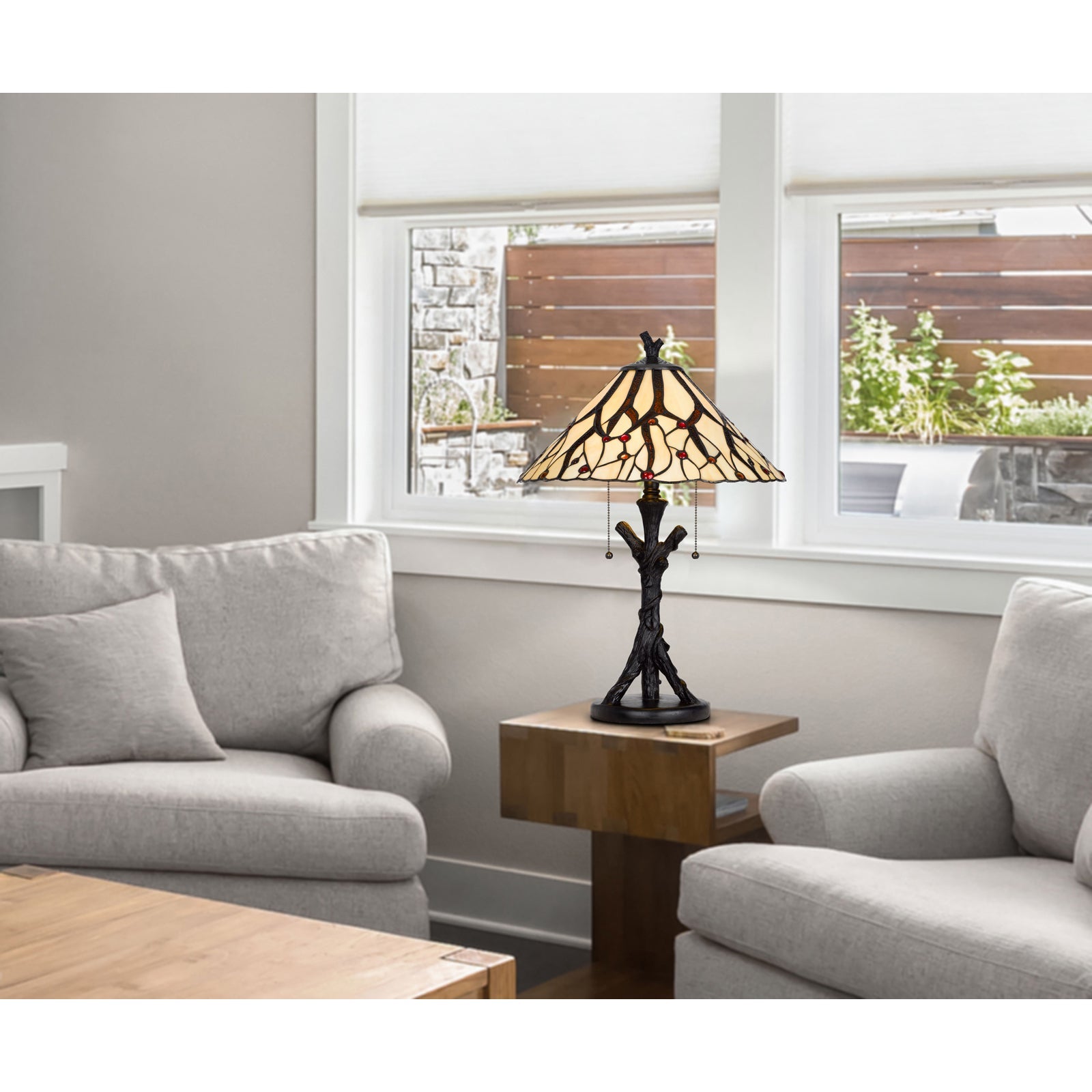 The BO-3104TB Tiffany Table Lamp is a stunning addition to any home decor, featuring a vibrant hand-painted Tiffany glass shade. Crafted from durable resin and metal, this lamp boasts a weighted base for enhanced stability. It requires two 60W bulbs with an E26 base and is conveniently operated with pull chain switches. Measuring 20.80 inches in length, 10.80 inches in width, and 25.00 inches in height, it ships in one carton and comes with a one-year warranty, ensuring its quality and craftsmanship.