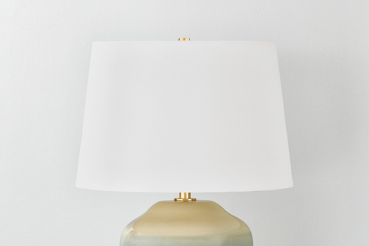 The Montville Table Lamp by Hudson Valley Lighting exudes elegance with its sophisticated design, featuring an aged brass finish combined with a ceramic crackle in emerald tide. This lamp stands at 28.50 inches tall and has a width of 19.00 inches, making it a striking addition to any room. It includes a linen shade that softly diffuses light, accommodating one E26 medium base bulb with a recommended wattage of 25W. The lamp is plug-in compatible and has an electrical rating of UL Dry, ensuring safety and reliability in various home settings.