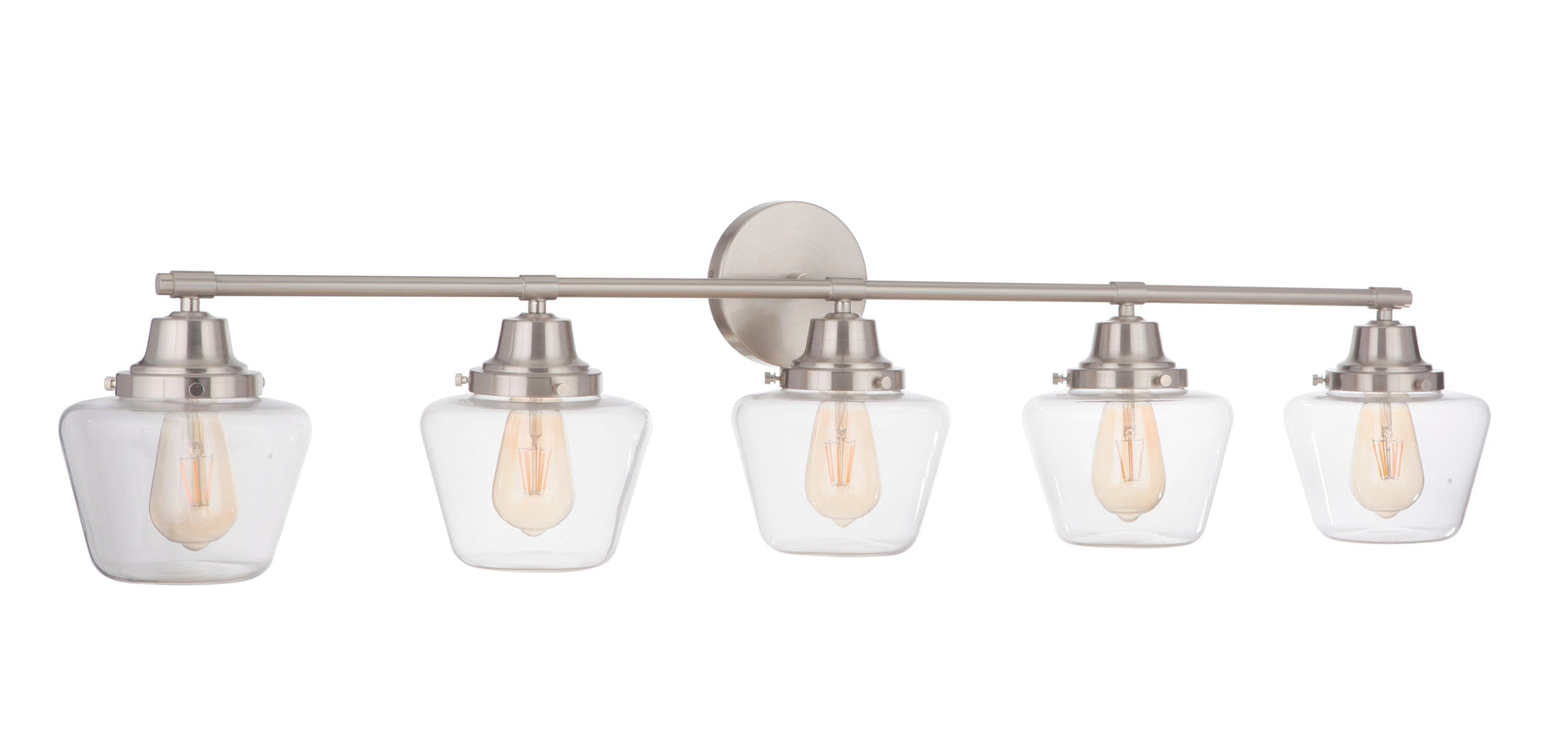 The Essex 5 Light Vanity in Brushed Polished Nickel is an elegant lighting fixture that combines timeless style with modern functionality. This vanity requires five medium base A19 bulbs, each with a maximum wattage of 60W (bulbs not included). The fixture measures 48.25 inches in width, 48.25 inches in depth, and 11 inches in height, featuring a stylish extension of 9 inches. It is designed for wall mount installation and is damp rated, making it ideal for bathroom settings. With clear glass shade design and a robust 1-year limited warranty, the Essex collection adds a touch of sophistication to any decor.