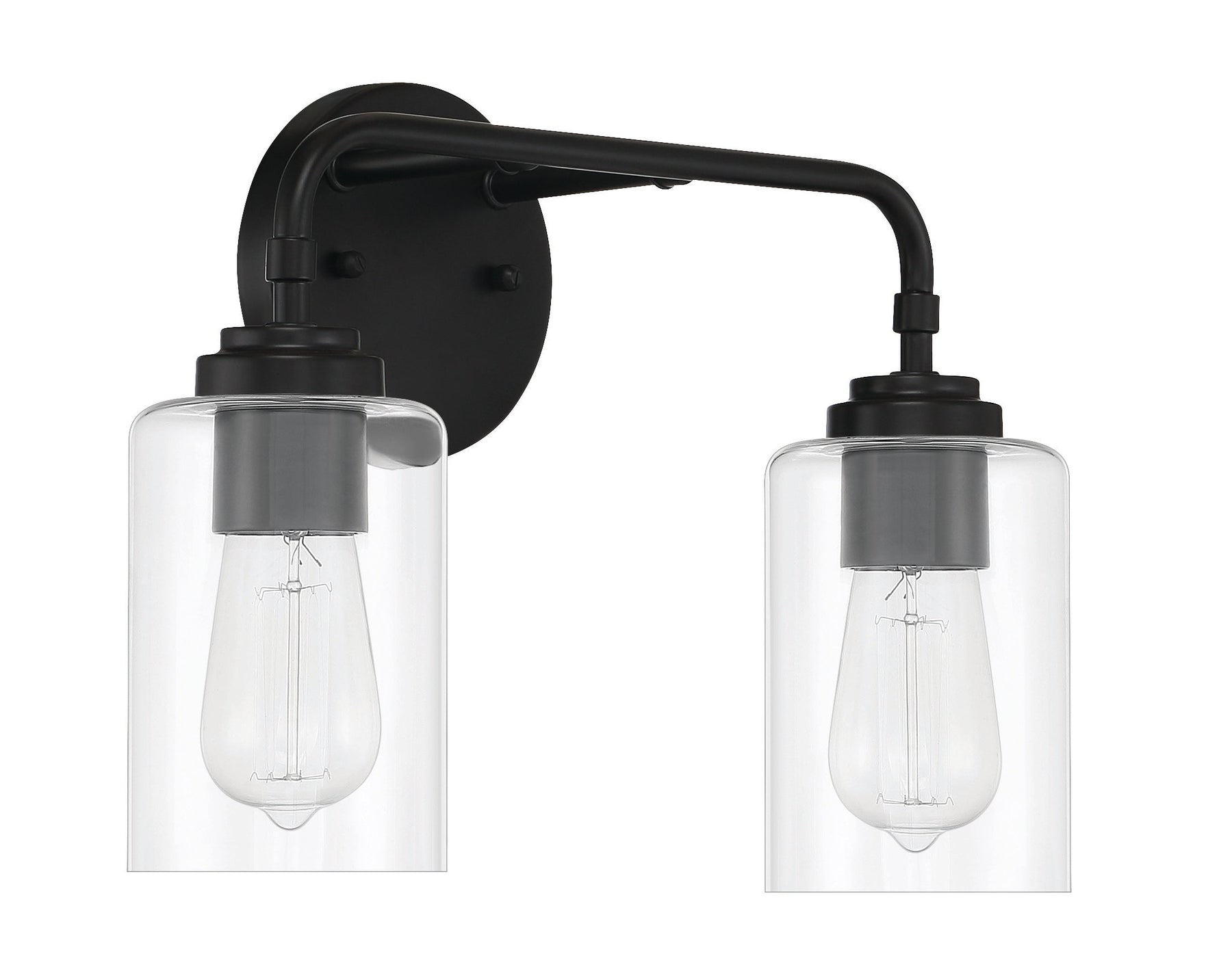 The Stowe 2 Light Vanity in Flat Black is a perfect addition for those desiring a sophisticated yet inviting atmosphere in their space. This vanity requires two medium base 60 watt bulbs (not included) and features stylish clear glass accents. With dimensions of 15 inches in width, 10.75 inches in height, and a depth of 15 inches, it has a sleek extension of 6.50 inches. The fixture is UL Damp rated, making it suitable for use in bathrooms or other humid areas, ensuring both style and safety.