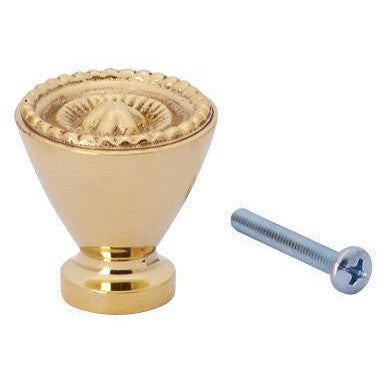 1 1/4 Inch Solid Brass Beaded Star Round Knob (Polished Brass Finish). Measures 1 1/4 inch in diameter with a projection of 1 1/4 inch. Comes complete with mounting hardware. This product comes as an unlacquered natural brass and it will patina over time. A high strength lacquer coating is available upon request. Available in several sizes and finishes including polished brass, antique brass, Black Bronze, polished chrome, Satin Nickel, and flat black.