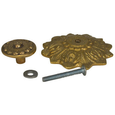 2 2/5 Inch Solid Brass Victorian Sunflower Knob (Polished Brass Finish)Measures 2 2/5 inch in diameter with a projection of 1 1/5 inch. Comes complete with mounting backplate and hardware. Available in several sizes and finishes including polished brass (shown), antique brass, Black Bronze, polished chrome, Satin Nickel, and flat black.