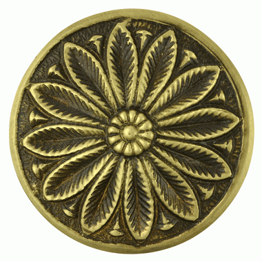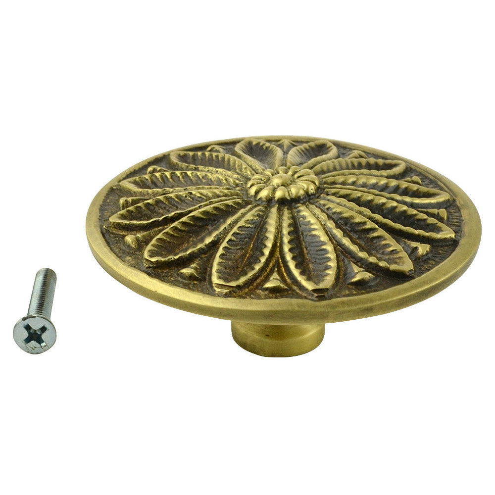 2 3/5 Inch Solid Brass Floral Leaf Cabinet Knob (Antique Brass Finish). Measures 2 3/5 inch in diameter with a projection of 1 1/5 inch. Comes complete with the mounting hardware. Comes in several finishes.