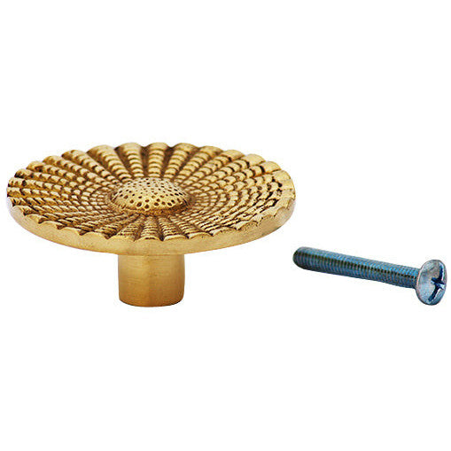 2 Inch Solid Brass Art Deco Style Round Knob (Polished Brass Finish). Measures 2 inch in diameter with a projection of 3/4 inch. Comes complete with mounting hardware. This knob is available in several sizes and available in different finishes including polished brass, antique brass, Black Bronze, polished chrome, Satin Nickel, and flat black.