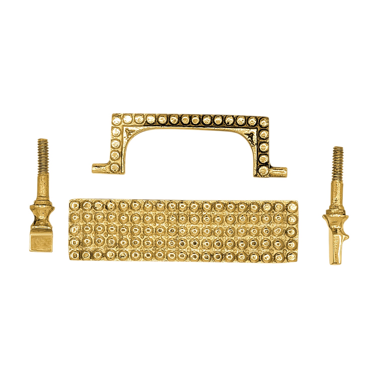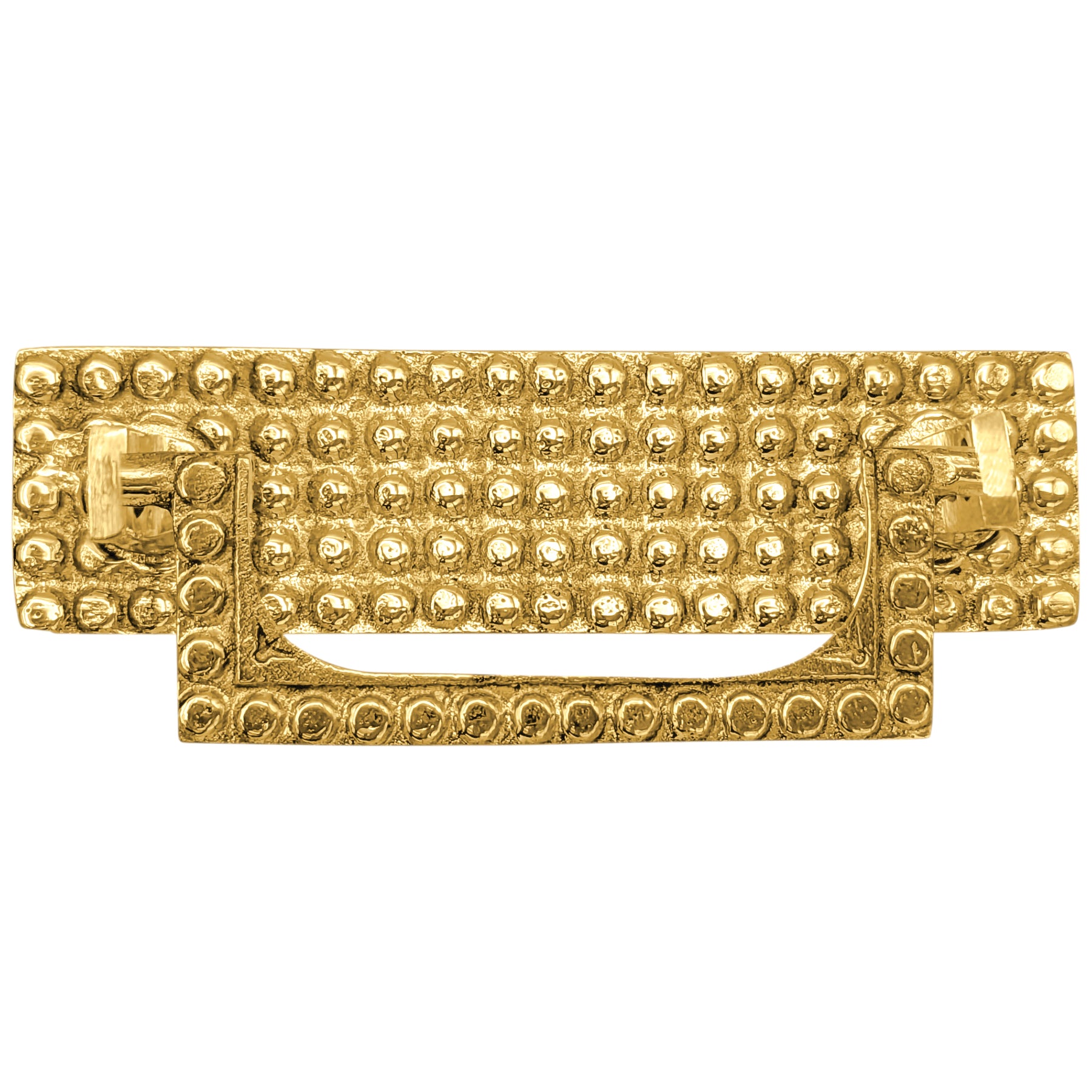 The plate measures 3 3/8 inches long and 7/8 inches tall with a center to center mounting distance is 2 1/2 inches. Hand-finished detailing. This pull handle has a projection of approximately 1 1/2 inches.