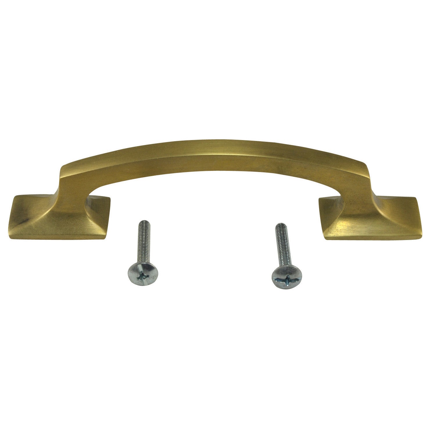 5 1/4 Inch Traditional Solid Brass Pull (Antique Brass Finish) - measures 5 1/4 inch long with 3 3/4 inch center-to-center mounting distance (3.75 c-c) with a projection of 1 1/4 inch. This solid brass pull is great for doors as well as larger cabinets or pieces of furniture. This is available in Polished Brass, Antique Brass (shown), Black Bronze, Flat Black, Polished Chrome and Satin Nickel.