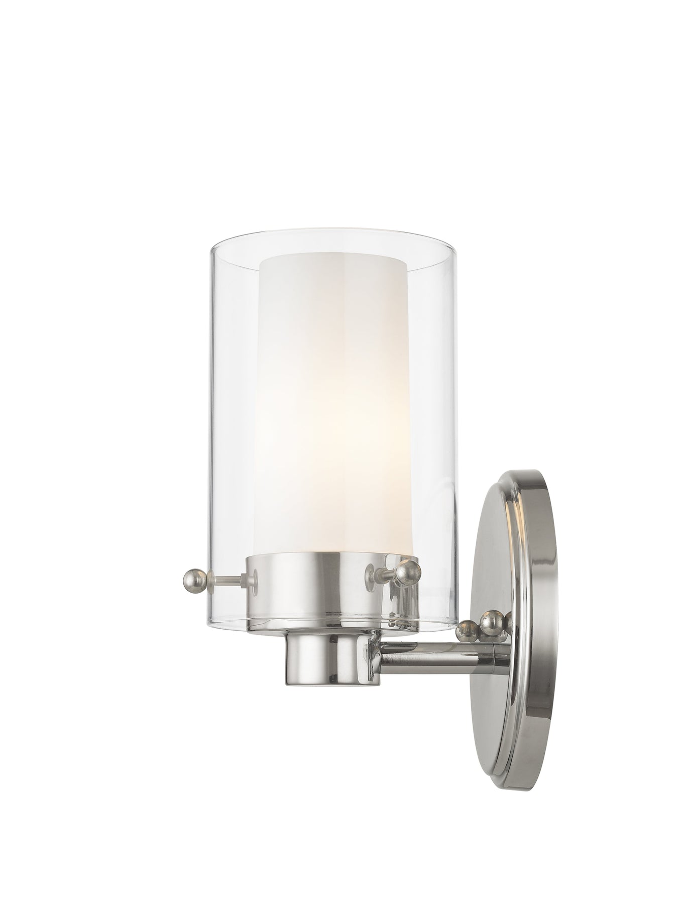 The 1541-05 Manhattan Bath Vanity fixture exudes posh sophistication with its transitional design. Measuring 5 inches in width and 8.75 inches in height, this polished chrome fixture features a sleek backplate that enhances its contemporary aesthetic. The single light is fitted with opal etched glass, surrounded by clear glass cylinders, creating a stunning double-glass effect. It requires one candelabra base bulb (not included) with a maximum wattage of 60W and is suitable for damp locations, making it a perfect addition to your bathroom decor.