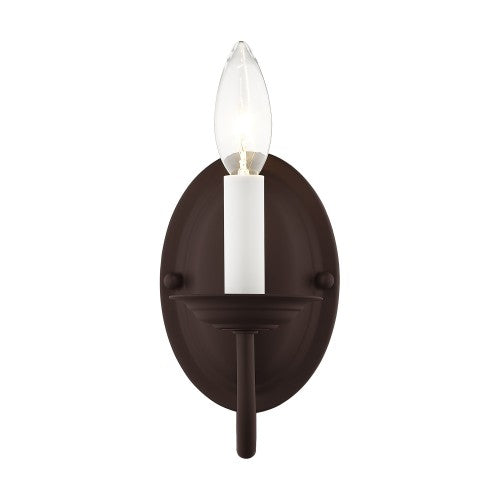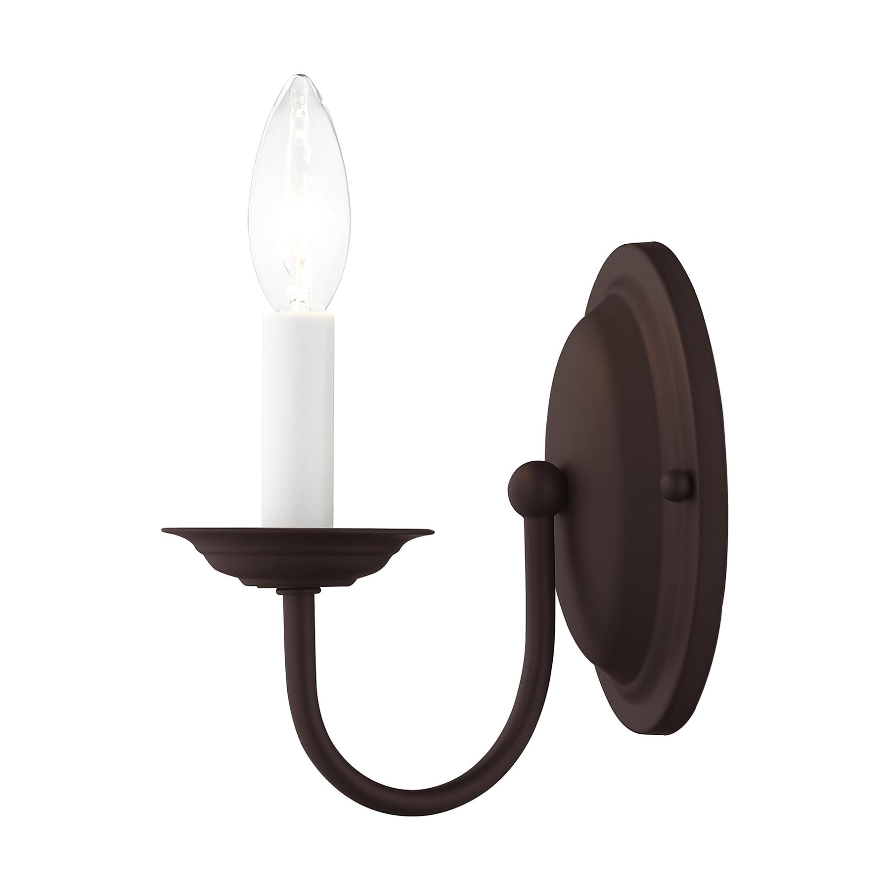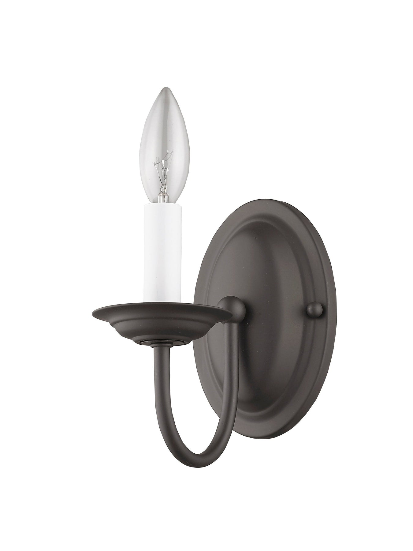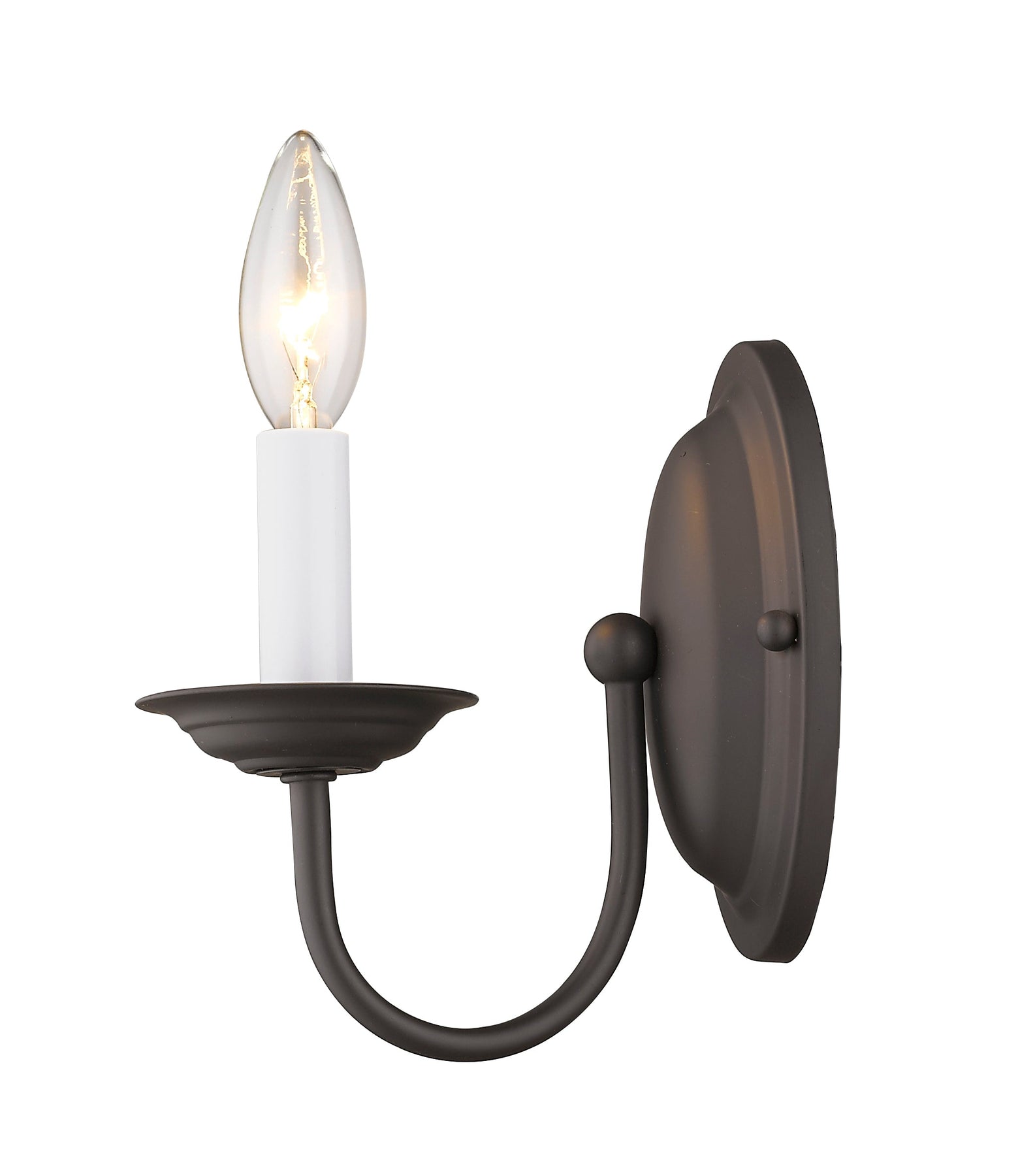 The 4151-07 Wall Sconce from the Home Basics collection is a captivating blend of traditional style and modern elegance. This fixture features a stunning bronze finish that complements its unique design, highlighted by an elegant sweeping arm. Measuring 4.25 inches in width and 9.25 inches in height, it extends 6.5 inches from the wall and requires one candelabra base bulb (not included) with a maximum wattage of 60W. Rated for damp locations, this transitional wall sconce is ideal for adding a touch of sophistication to various spaces.