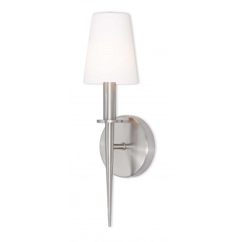 The Witten Wall Sconce in Brushed Nickel offers a contemporary touch to any space with its stylish design. Measuring 4.25 inches in width and 14.5 inches in height, this sconce features a hand-blown opal white glass shade that adds a sophisticated flair. It accommodates one candelabra base bulb (not included) with a maximum wattage of 60W. With an extension of 3.95 inches and rated for damp locations, the Witten is a versatile lighting choice suitable for various indoor settings.