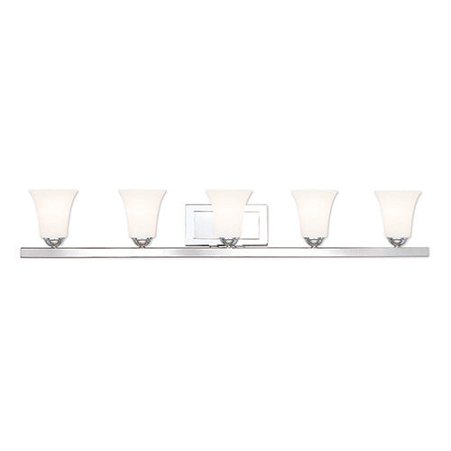 The 6485-05 Ridgedale Bath Vanity fixture combines a modern geometric design with functional elegance, perfect for enhancing powder rooms and bathrooms. Measuring 43.25 inches in width and 7 inches in height, this vanity light features a polished chrome finish that adds a sleek touch. It is designed with five medium base bulbs (not included), accommodating a maximum wattage of 100W per bulb, and offers both uplight and downlight capabilities. Made from durable steel and complemented by satin opal white glass, this fixture is suitable for damp locations, ensuring it can withstand humid environments while providing lasting illumination.