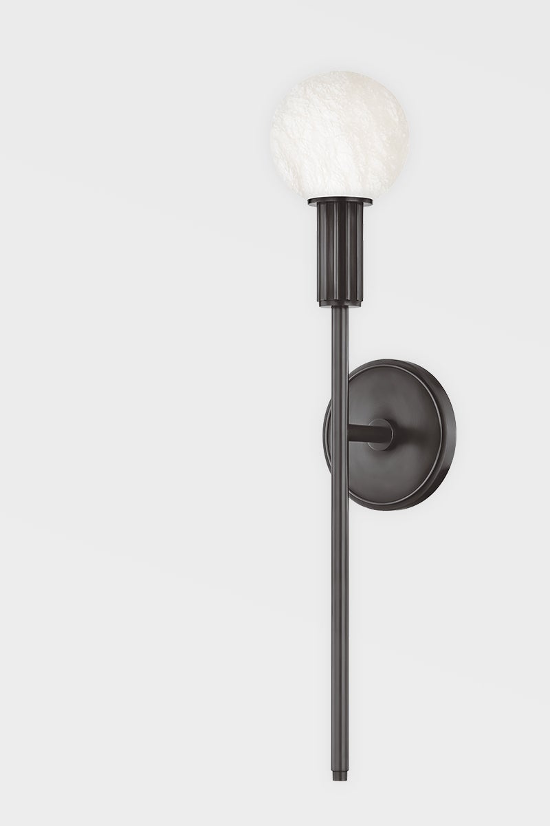 The Murray Hill Wall Sconce by Hudson Valley Lighting features a stunning alabaster shade in white, providing elegant illumination for your space. With a height of 22.00 inches, a width of 4.50 inches, and an extension of 5.00 inches, this sconce is designed to enhance your decor without overwhelming it. It is equipped with a G9 socket that supports a recommended G9 LED bulb with a wattage of 4.00, ensuring energy efficiency. The fixture is available in Aged Brass and Distressed Bronze finishes, and it is UL Damp rated, making it a suitable choice for use in humid areas such as bathrooms.