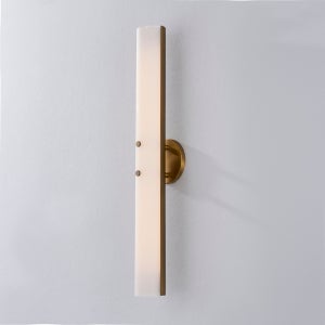 The Titus Wall Sconce by Troy Lighting features an elegant opal glass shade that provides a warm glow with a color temperature of 2700K and a high Color Rendering Index (CRI) of 90. This stylish fixture measures 4.75 inches in width and 25.75 inches in height, with a 3.75-inch extension from the wall. It uses an integrated LED socket to deliver a powerful 975 lumens while consuming just 23 watts. Ideal for damp locations, this sconce is field serviceable and available in two beautiful finishes: Patina Brass and Polished Nickel.