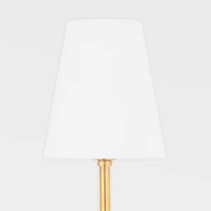 The Ramona Wall Sconce by Mitzi is a versatile and elegant lighting option that enhances any space with its classic design. This fixture features a sleek height of 20 inches and a width of 5 inches, with a 5.5-inch extension from the wall. The soft white linen shade beautifully diffuses light, while the aged brass finish adds a touch of sophistication. Designed to hold one E12 candelabra base bulb (not included) with a maximum wattage of 60W, it is suitable for a variety of settings and is UL Damp rated, making it a perfect choice for bathrooms or other humid areas.